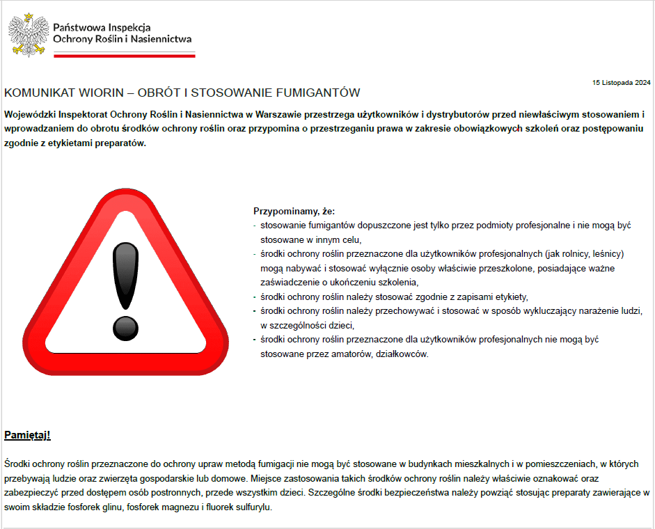 KOMUNIKAT Wojewódzkiego Inspektora Ochrony Roślin i Nasiennictwa w Warszawie