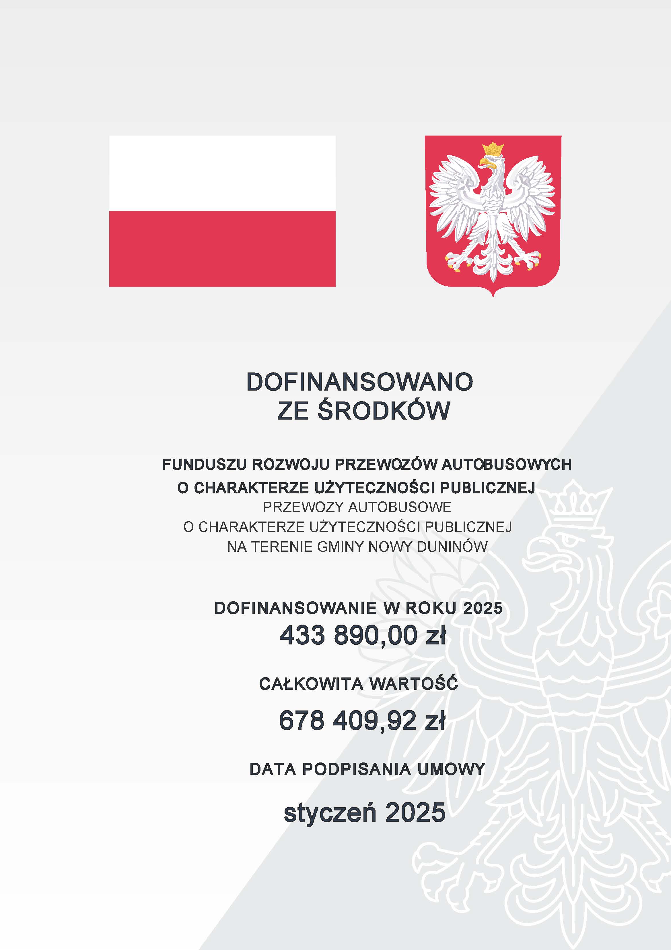 Wójt Gminy Nowy Duninów podpisał umowę z Wojewodą Mazowieckim na dofinansowanie linii komunikacyjnych przebiegających po terenie Gminy Nowy Duninów. Umowa została podpisana na lata 2025 – 2029. Na 2025r. przyznane zostało dofinansowanie w kwocie 433 890 zł, całkowita wartość zadania to kwota 678 409,92 zł. Operatorem publicznego transportu zbiorowego w gminie Nowy Duninów jest Przedsiębiorstwo Komunikacji Samochodowej w Gostyninie. Pomoc finansowa w realizacji zadań własnych organizatora w zakresie przewozów autobusowych o charakterze użyteczności publicznej dla Gminy Nowy Duninów, ze strony Mazowieckiego Urzędu Wojewódzkiego jest bardzo pomocną strategią w rozwoju transportu publicznego w naszej gminie.