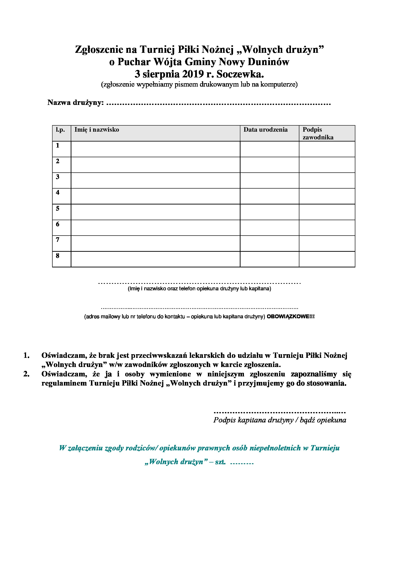 3 sierpnia 2019 r. spotkamy się na VI „Turnieju Wolnych Drużyn” o Puchar Wójta Gminy Nowy Duninów. Jest to Turniej otwarty bez ograniczeń wiekowych.