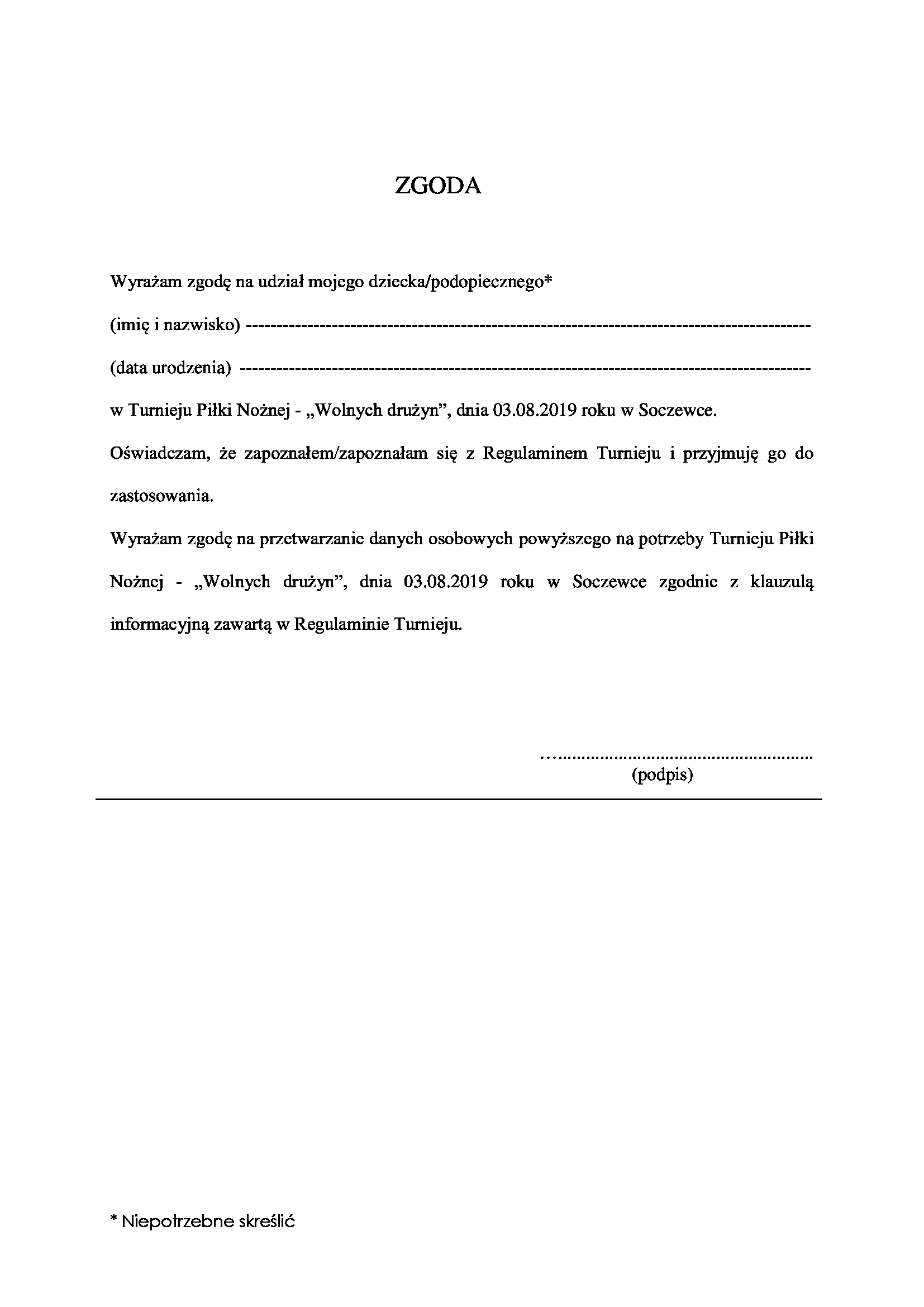 Ilość drużyn jest ograniczona. Decyduje kolejność zgłoszeń. Zgłoszenia przyjmujemy do dnia 30 lipca 2019 r. do godz. 15.00. Pamiętajcie o zasadzie – w drużynie może grać tylko jeden zawodnik zrzeszony (czynnie uprawiający piłkę nożną).